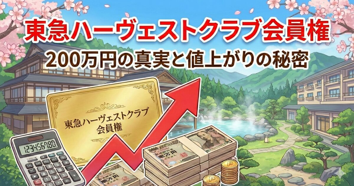 「憧れのリゾート会員権が200万円!これなら買える!」 ……ちょっと待ってください。その金額、「会員権本体」だけの値段ではありませんか? 東急ハーヴェストクラブは、購入時と保有中に「意外な諸経費」がかかります。これを知らずに飛びつくと後悔することに。 しかしその一方で、一部の人気施設では**「買った値段の2倍位上で売れる」**という驚きの現象も起きています。 今回は、パンフレットには小さくしか書かれていない「費用の全貌」と、知る人ぞ知る「資産としての値上がり」について、徹底的にシミュレーションします。 1 ...