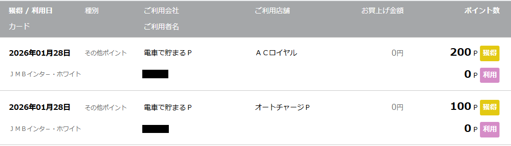 下のスクリーンショットは、10000円分のオートチャージを行ったときのポイントの付与です。合計300ポイントが付与されています。