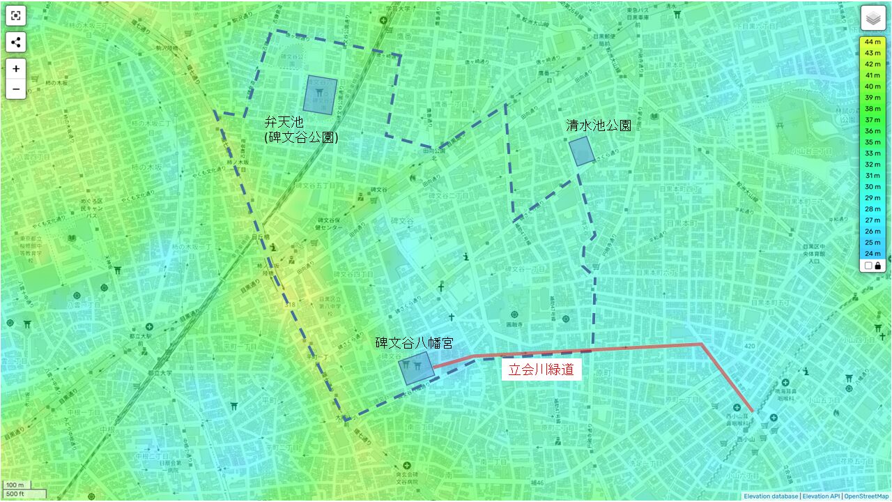 碑文谷の地形図を見てみましょう。標高としては決して低くないものの、弁天池から碑文谷八幡宮、そして立会川緑道に沿って、相対的に標高が低いのがわかります。また、碑文谷と目黒本町の境界ですが、清水池公園から立会川緑道までも標高が相対的に低いです。これは、弁天池と清水池から湧き出た水がその部分を通って流れていたと考えられます。